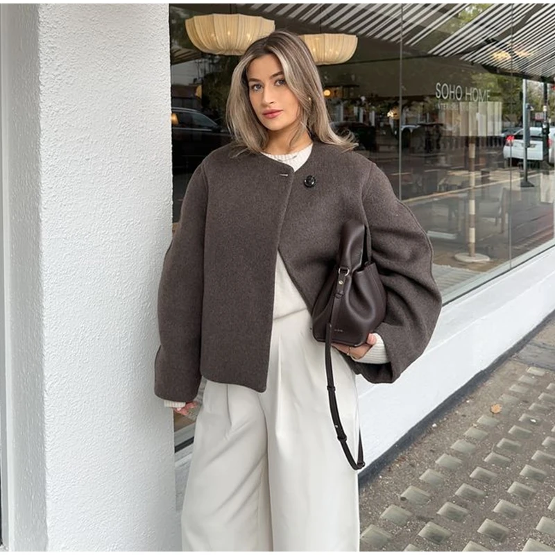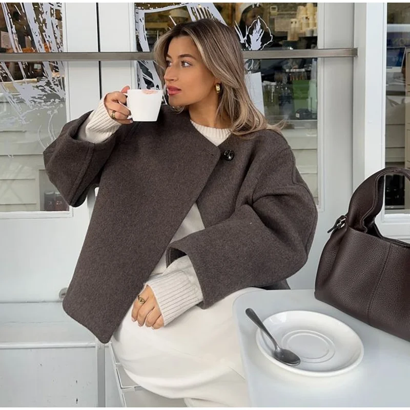 Meet TIFFANY, the epitome of understated chic for modern women. This elegant wool coat features a clean, solid-color design, an O-neckline, and a single-button closure, making it the ideal layering piece for autumn. Perfect for casual outings or a polished office look, TIFANNY effortlessly transitions between professional and relaxed settings. TIFANNY’s design highlights refined simplicity with subtle sophistication. The straight cut and long sleeves create a flattering silhouette, while the soft wool fabric provides warmth and comfort on cooler days.